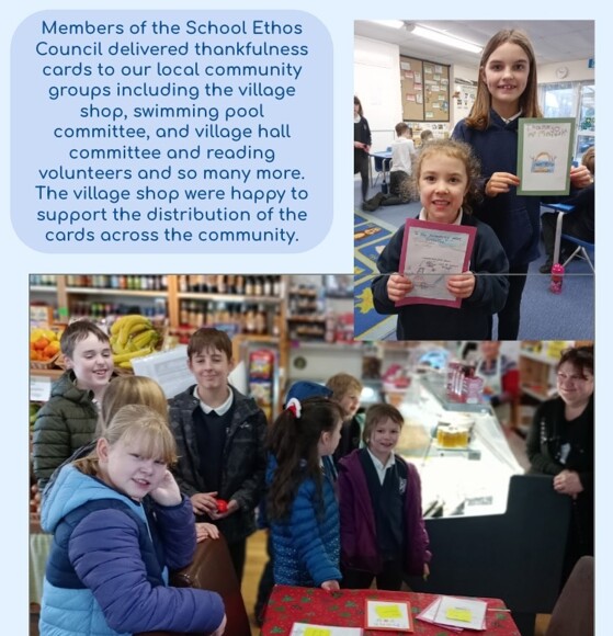 Members of the School Ethos Council visited members of our local community to deliver thankfulness cards created by the children. These were shared with a range of valued community groups, including the village shop, swimming pool committee, village hall committee and our reading volunteers, among many others. We were grateful to the village shop for their support in helping to distribute the cards across the wider community, strengthening the links between school and village.